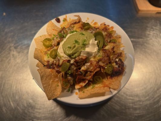 Pulled Pork Nachos with mozzarella cheese, jalapeno, guacamole, sour cream.