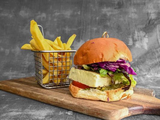 with pesto mayo, tomato & green leaf salad (V/VA*/GFA) (Gluten Free bun available)