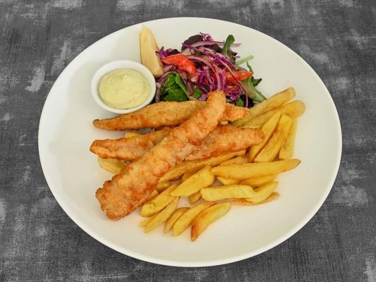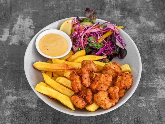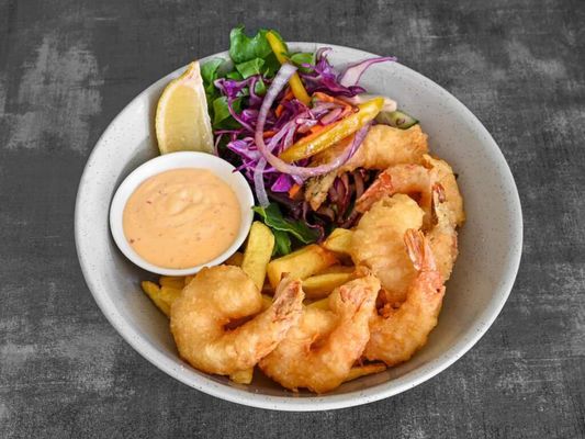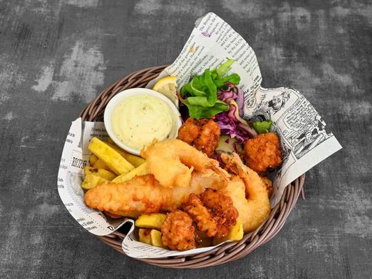 Salad with battered fish, tempura prawns, calamari & chips. Tartare Sauce. (V)