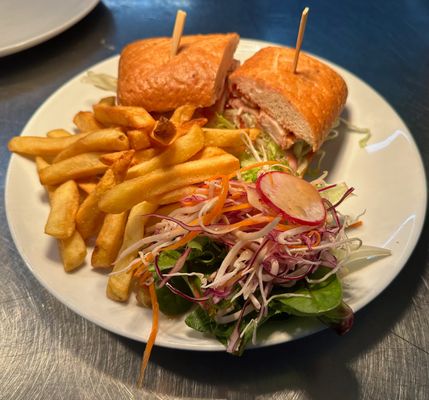 Our own inspired Club Sandwich with Chicken, mayo, tomato, bacon, egg, Lettice. all on a flat style bun. (VA)