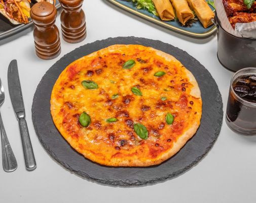 10" pizza base. Topped with tomato sauce, mozzarella, and fresh basil. (GFA)