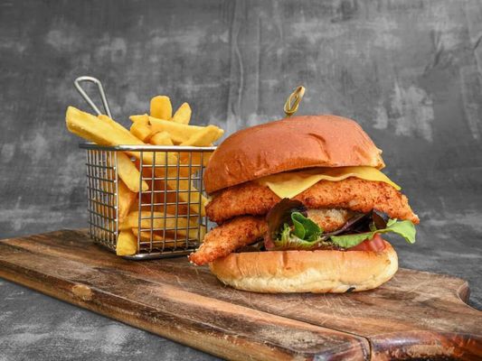 Burger & Chips (5 Options) (GFA). BEEF BURGER (with salad, tomato, cheese & burger sauce) (GFA) AUSSIE BURGER (with salad, tomato, cheese, pineapple, beetroot & burger sauce) (GFA) PERI PERI CHICKEN BURGER (with slaw) (GFA) CHICKEN SCHNITZEL BURGER (with lettuce, tomato, cheese, mayo) (GFA) PULLED PORK BURGER (with slaw) (GFA) HALLUOMI BURGER (with pesto mayo, tomato & green leaf salad) (V/VA*) (gluten free available) Upgrade to sweet potato wedges - available