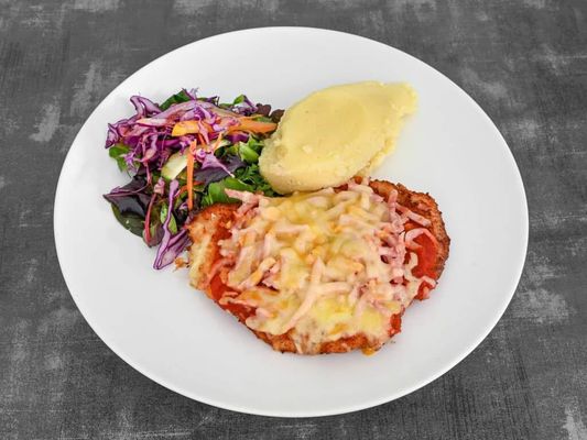 topped with tomato sauce, ham & cheese. (with Chips & Salad) (GFA)