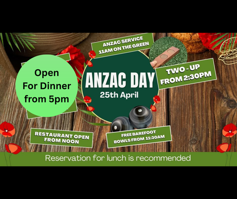 ANZAC Day We have put together a fantastic day. Start with time to reflect at the ANZAC Service at 11 am - all welcome. Enjoy lunch with delicious food from noon. Listen to wonderful live music by Scott the Entertainer from noon. Play free barefoot bowls from 11:30 am. Join your mates for a game of Two Up at 2:30 pm. The restaurant will be open for dinner too. Book to make sure you have a place for lunch and lawn bowls.