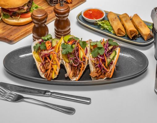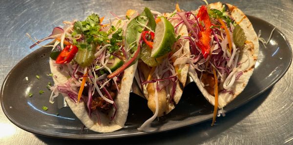 Trio of Tacos, topped with slaw and chipotle pickle. including 1x Pork, 1x Fish and 1x Beef taco. Or Create you own !! (GFA)
