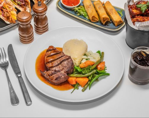 (with Mash & steamed Vegetables) or choice of 2 sides. (GF)