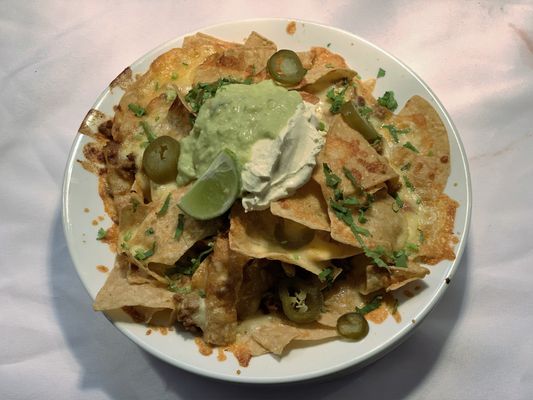 Beef Nachos with mozzarella cheese, jalapeno, guacamole, sour cream.